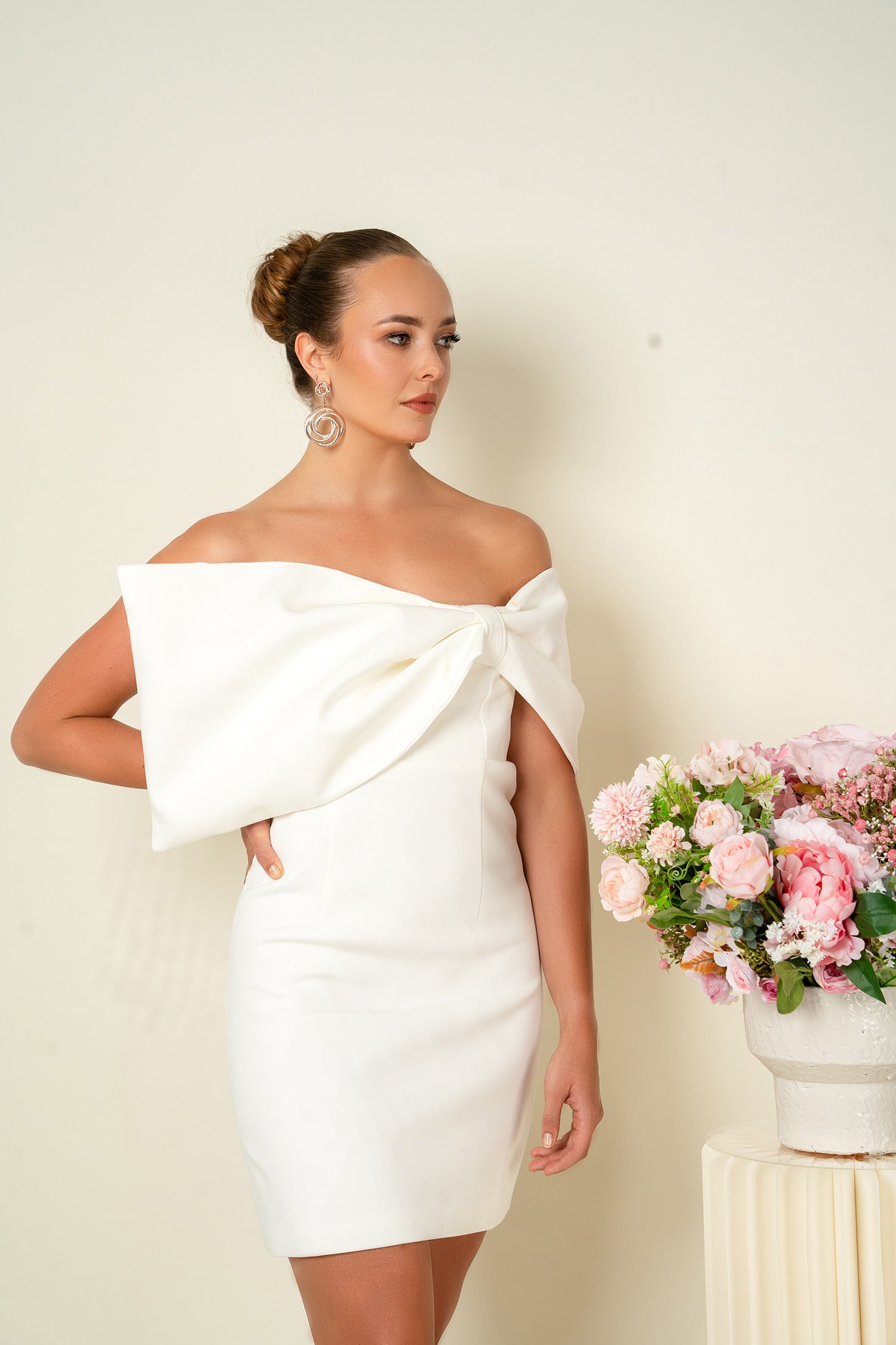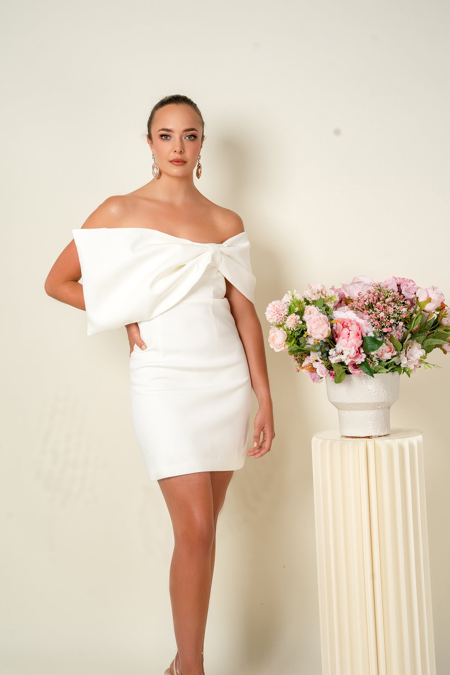 This large bow off shoulder dress is made to show off your curves with a bodycon fit that hugs you in all the right places. Stretchy fabric and a smocked waist give you a sexy silhouette.