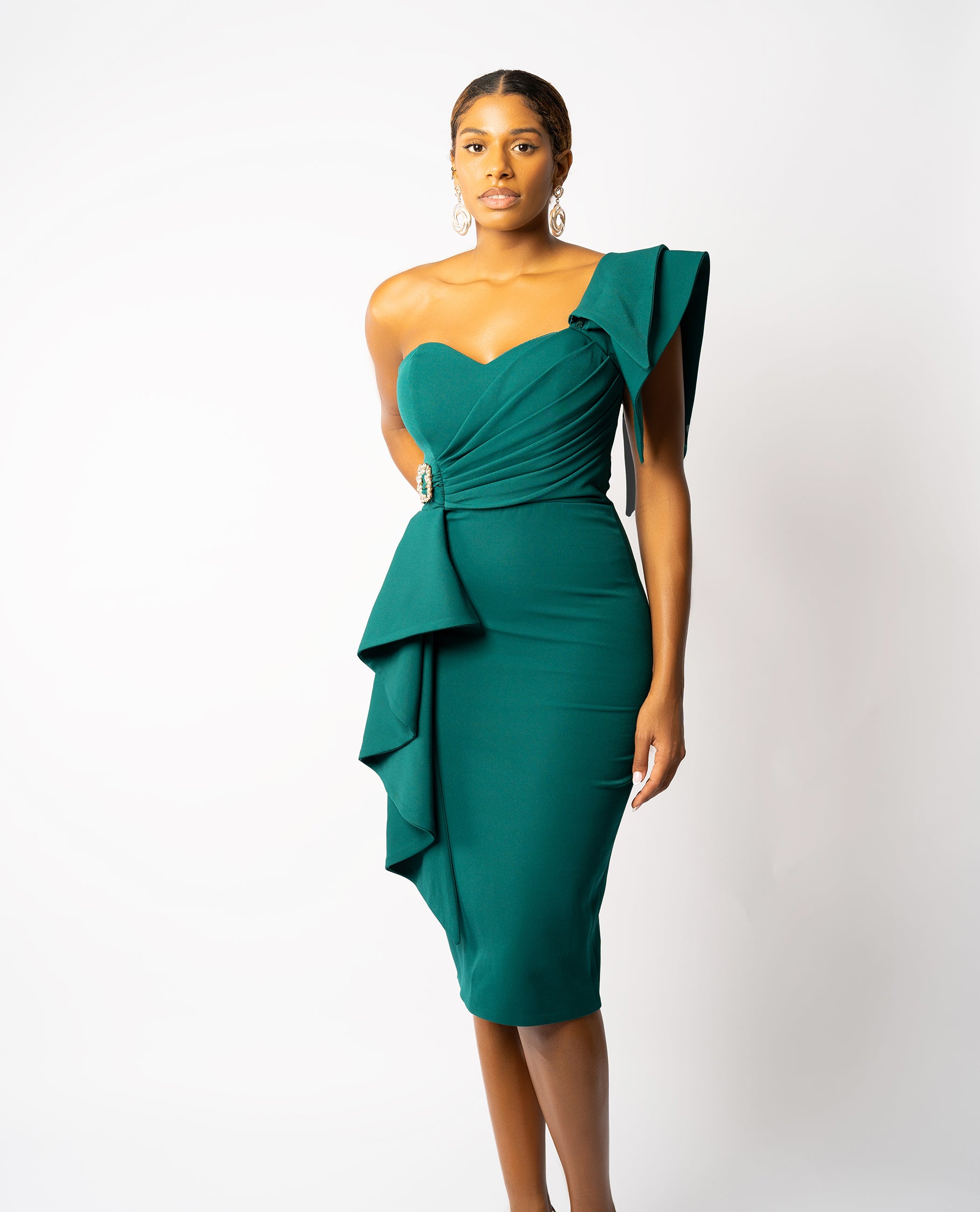 Our Gracia stylish one shoulder dress with a comfortable draped waist. This midi dress comes in an easy-to-wear, versatile style that you can wear for your next party or special occasion all year long.