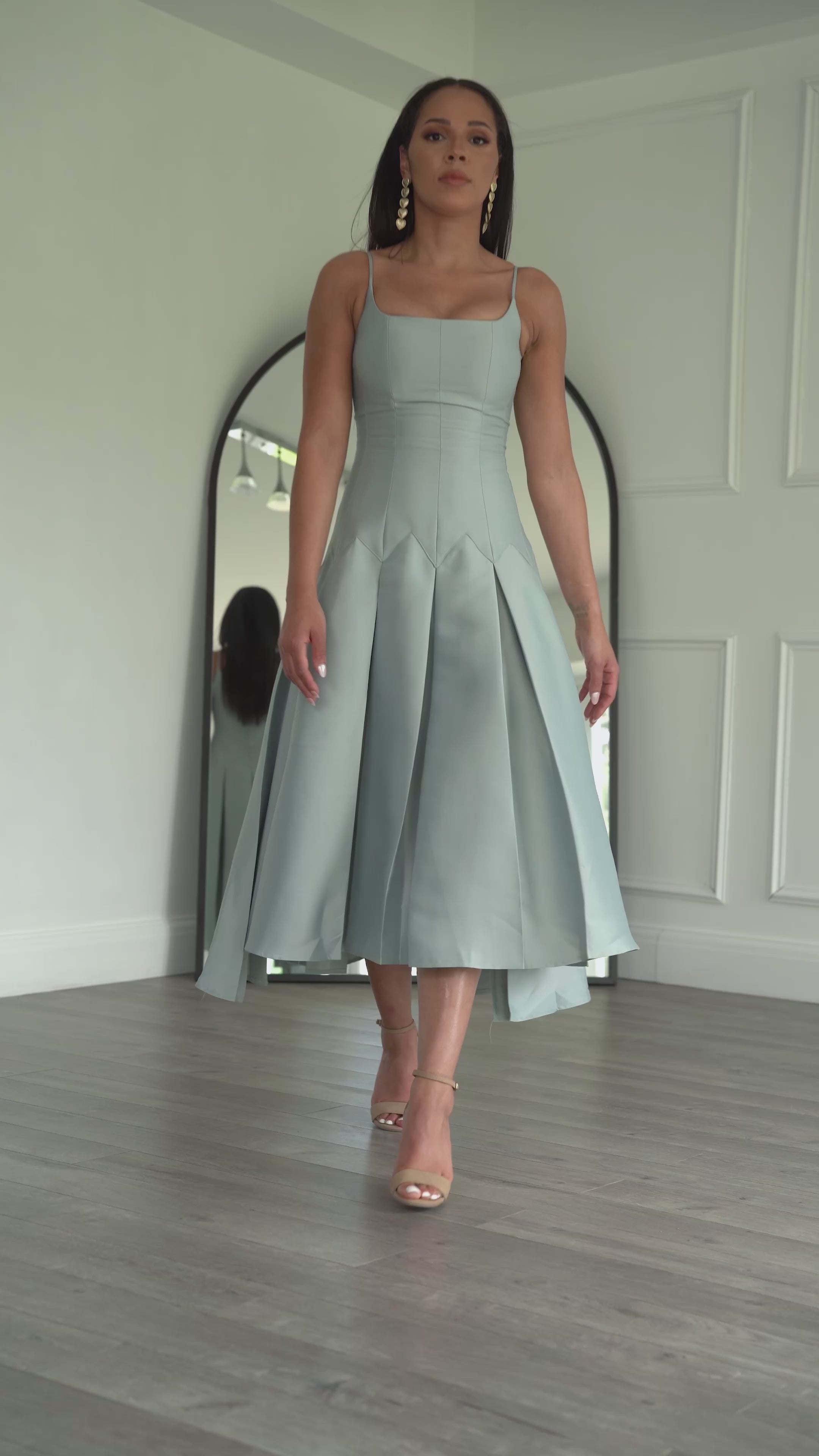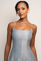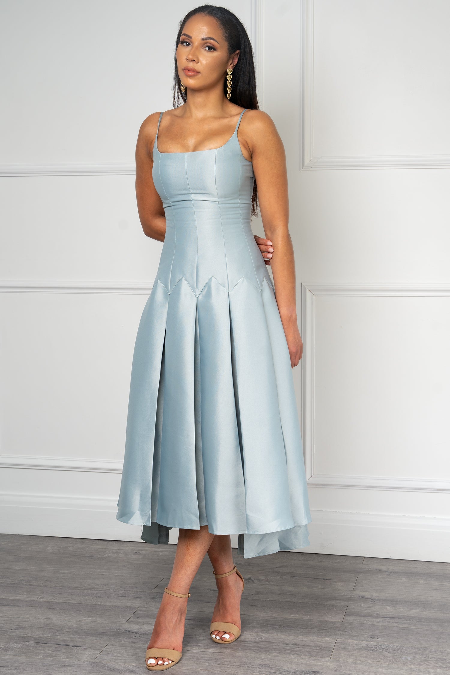 A flowing and elegant silhouette, this blue midi dress features a skirt that cascades with delicate pleats. The  fabric woven drapes beautifully, skimming your curves and creating a flattering fit.The bodice can vary, offering a neckline detail scoop neck and spaghetti hand.
