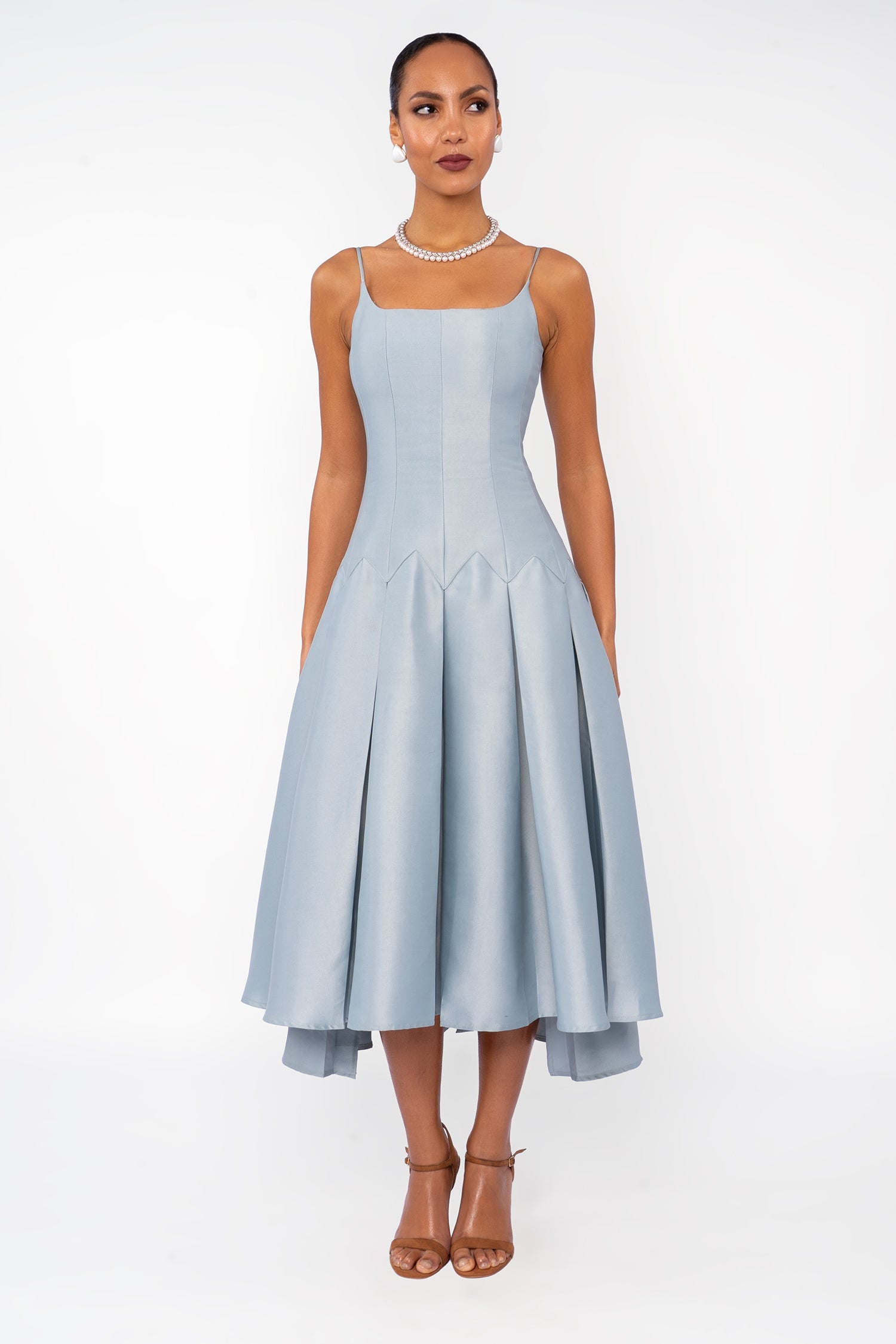 A flowing and elegant silhouette, this blue midi dress features a skirt that cascades with delicate pleats. The fabric woven drapes beautifully, skimming your curves and creating a flattering fit.The bodice can vary, offering a neckline detail scoop neck and spaghetti hand.