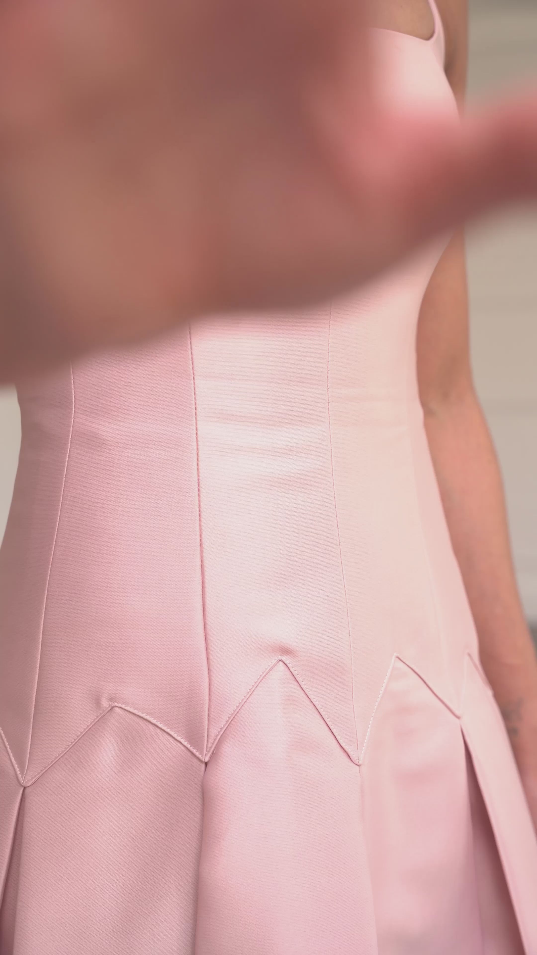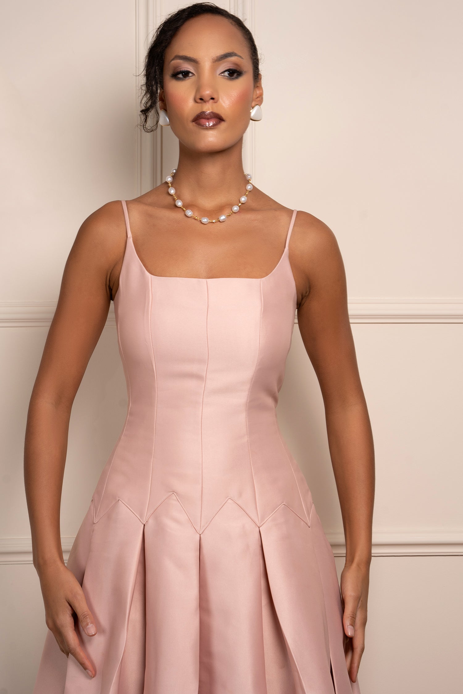 A flowing and elegant silhouette, this pink midi dress features a skirt that cascades with delicate pleats. The fabric woven drapes beautifully, skimming your curves and creating a flattering fit.The bodice can vary, offering a neckline detail scoop neck and spaghetti hand.