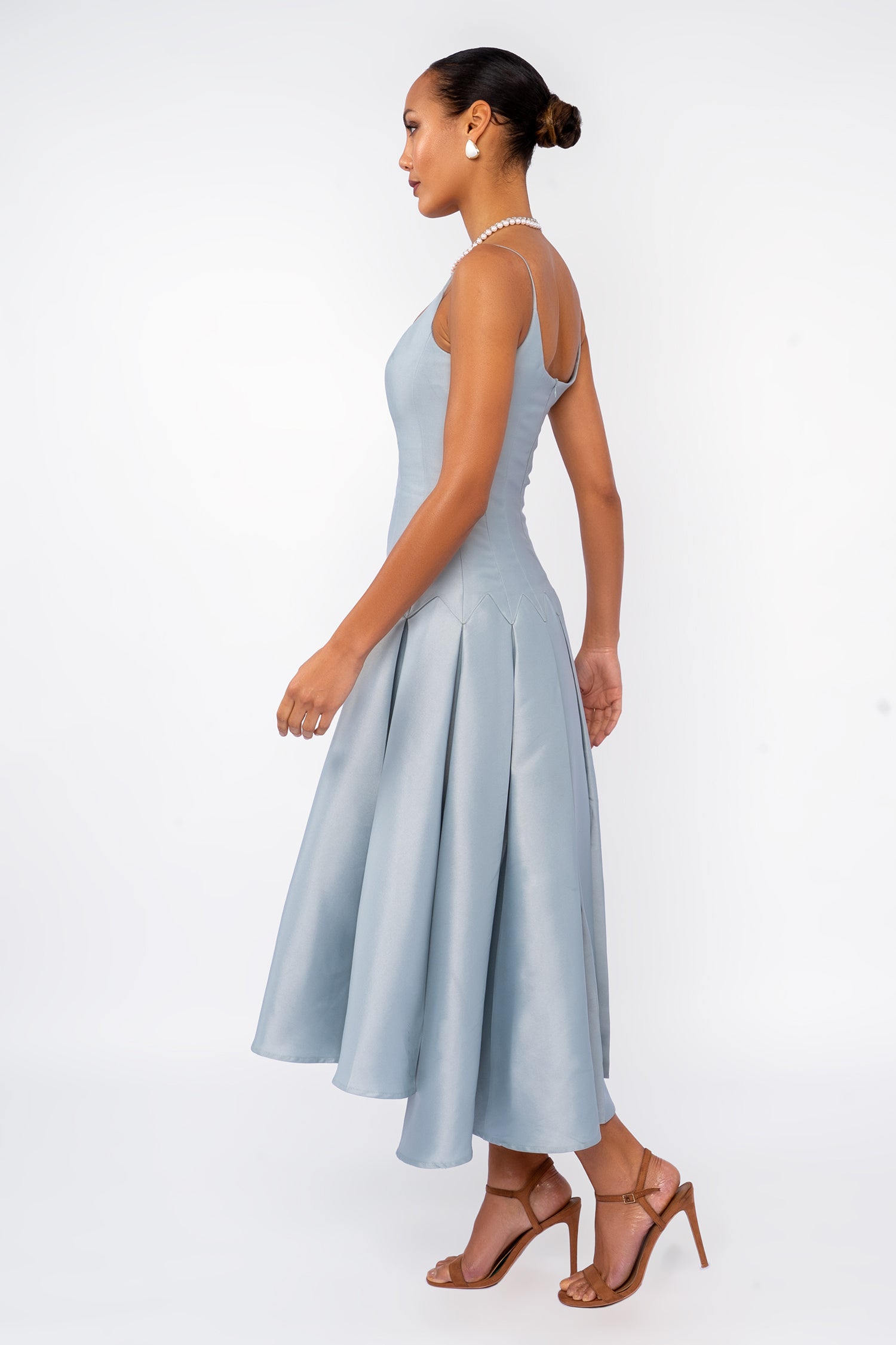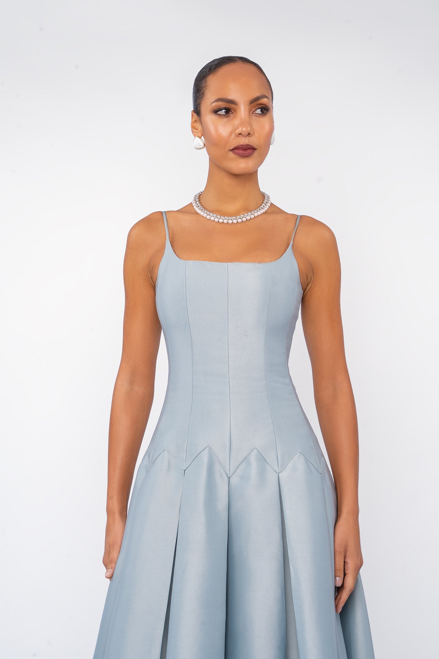 A flowing and elegant silhouette, this blue midi dress features a skirt that cascades with delicate pleats. The  fabric woven drapes beautifully, skimming your curves and creating a flattering fit.The bodice can vary, offering a neckline detail scoop neck and spaghetti hand.